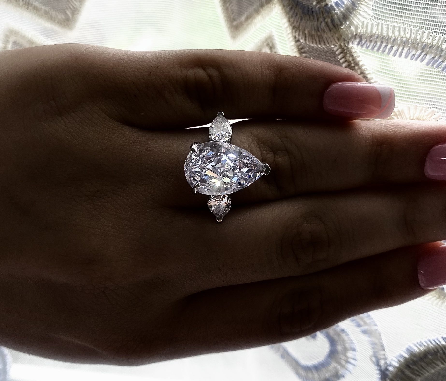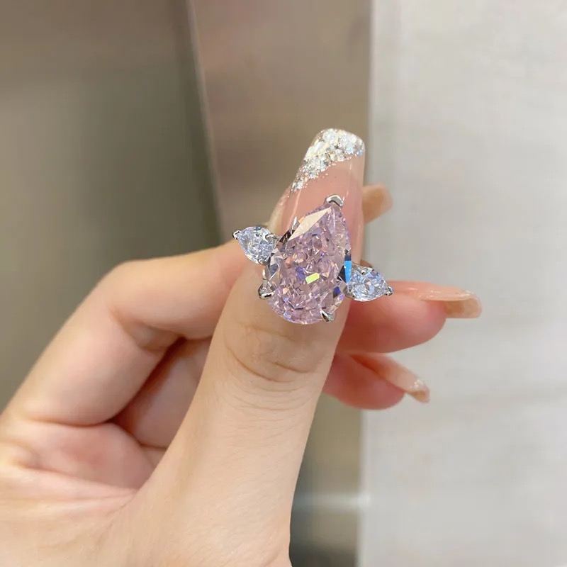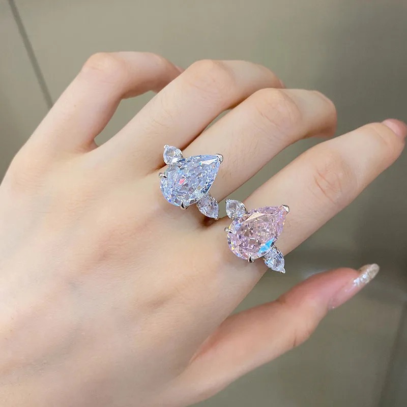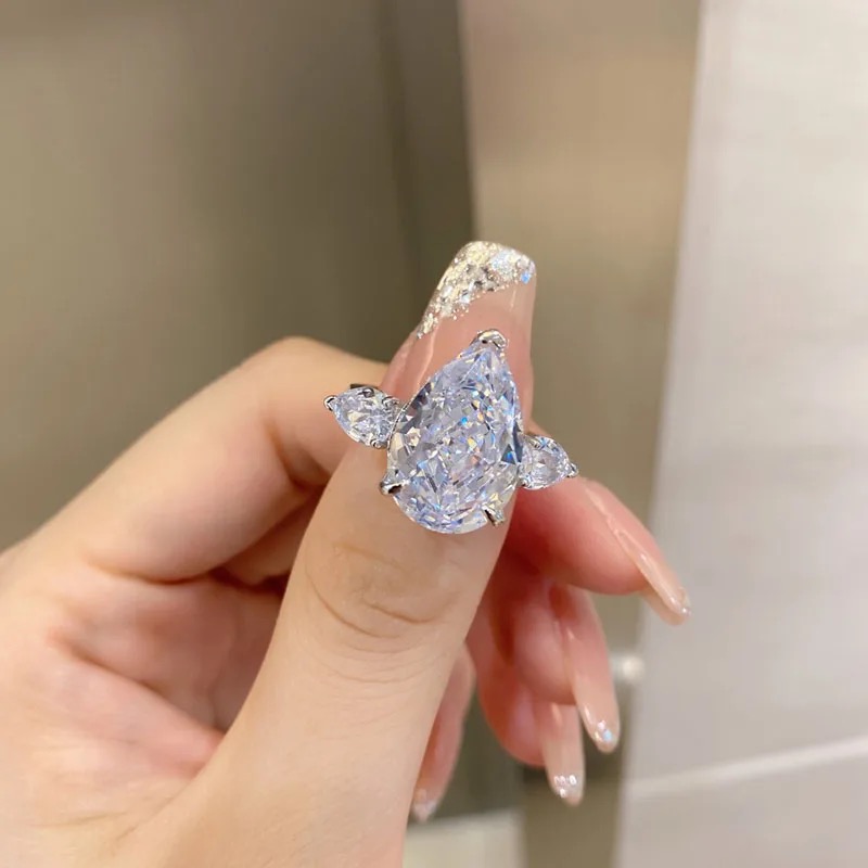 This exquisite ring showcases a dazzling 6-carat pear-cut zircon stone of the highest quality, boasting an exceptional 8A grade rating for its remarkable brilliance and clarity. Flanked gracefully on both sides of the pear-cut centerpiece are two smaller, complementary stones, enhancing the overall allure of this fine jewelry piece. The 8A grade zircon at the heart of the design ensures an intense sparkle and pristine quality, making this ring a captivating symbol of elegance and sophistication. Its timeless design and premium gemstones make it a perfect choice for special occasions or as a cherished gift, embodying a refined sense of style and beauty.